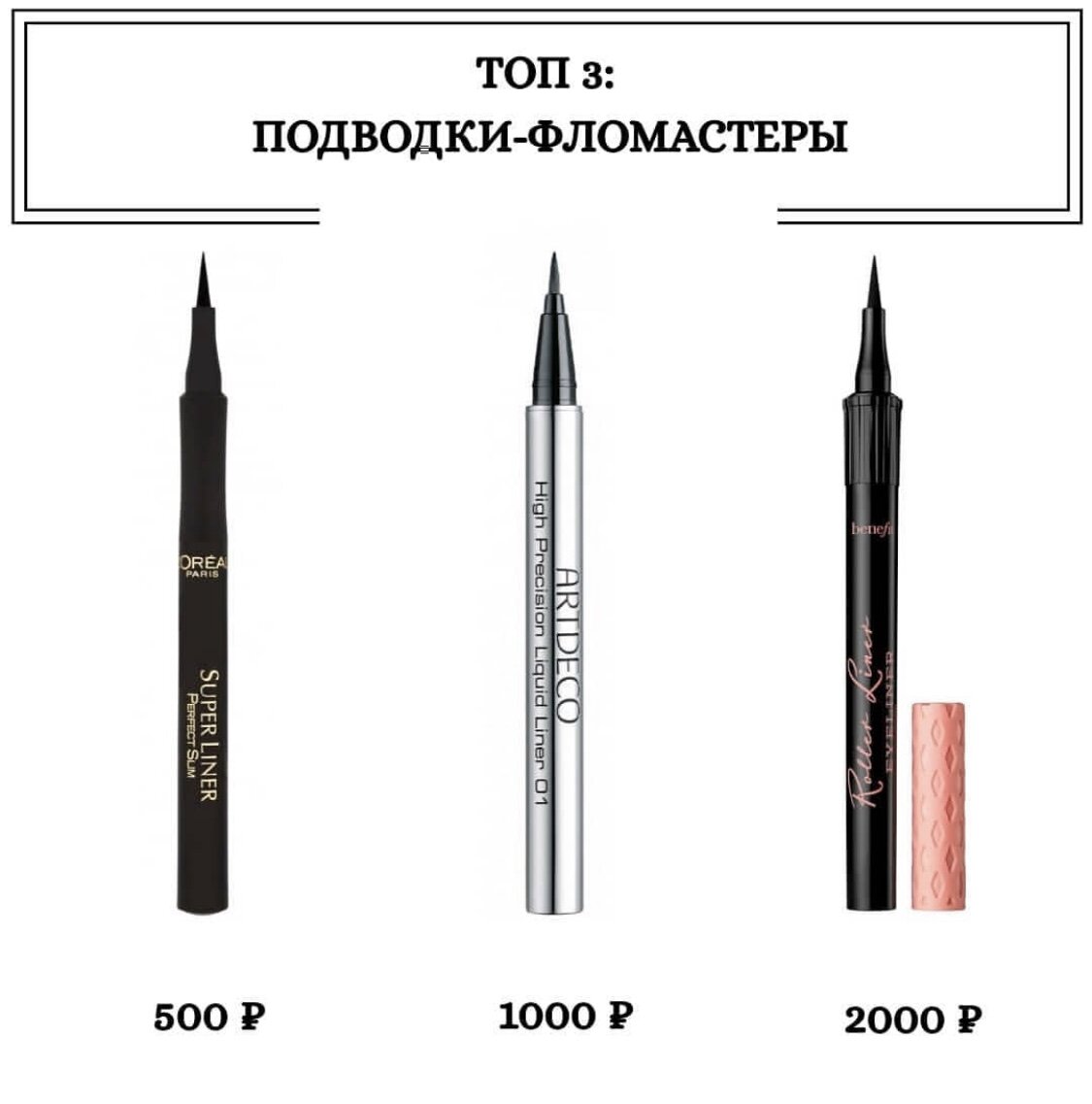 Подборка лучших подводок-фломастеров, которые сами нарисуют вам идеальные стрелки! 1️⃣ BENEFIT Roller Liner. Подводка из сегмента люкс. Можно купить в Иль де Боте. Цена ~ 1900₽ 2️⃣ ARTDECO High Precision Liquid Liner. Подводка из среднего ценового сегмента. Можно приобрести в Летуаль. Цена ~1000₽. ⠀ 3️⃣ L'OREAL Super Liner Perfect Slim. Бюджетная подводка, стоит ~500₽, продаётся в массмаркетах. Все три подводки имеют схожие плюсы и ни в чем не уступают друг другу: ⠀ ⠀ ❣ стойкость в течение всего дня ❣ удобное нанесение ❣ интенсивный цвет ❣ лёгкость в использовании ⠀ ⠀ ✅Подходят даже для новичков по стрелочкам. А вы знали о том, что подводку-фломастер нужно хранить в вертикальном положении колпачком вниз, чтобы она дольше вам прослужила?
