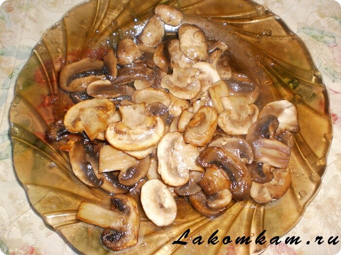 Приготовление салата «Охотничий». Грибы нарезаем произвольно и обжариваем.