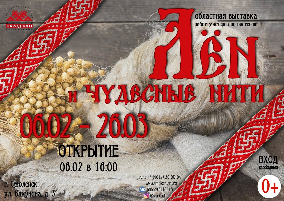 6 февраля в 16 часов в выставочном зале Центра народного творчества состоится открытие областной выставки работ мастеров декоративно-прикладного искусства «Лен и чудесные нити». - Гости экспозиции увидят расписные и плетеные картины, шали, игрушки. Диковины, исполненные смоленскими умельцами из «самого славянского материала», восхитят каждого посетителя, а кого-то, возможно, сподвигнут на личные творческие свершения, – сообщили на официальном сайте Центра народного творчества. Вход свободный. Мероприятие 0+