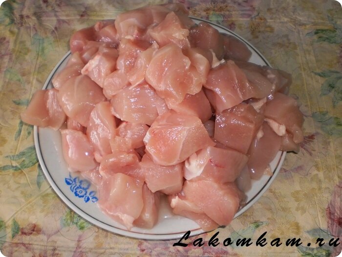 Приготовление куриного шашлыка с ананасом в духовке. Куриное филе нарезаем средними кусочками.