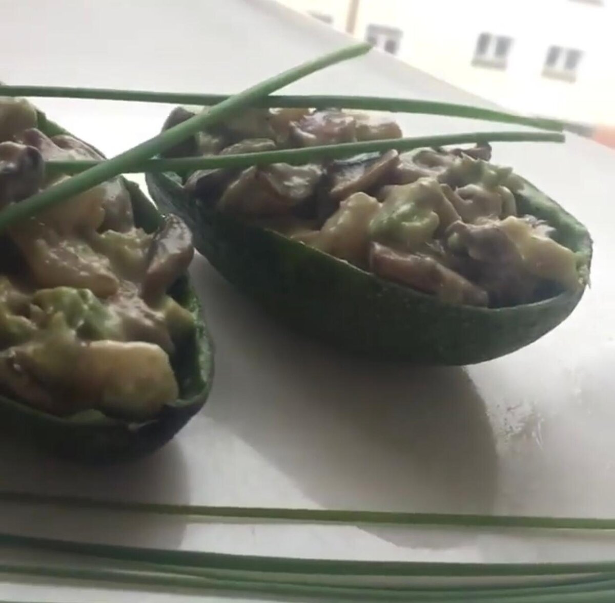Я все таки смогла повторить салат, как я ресторане. Итак, аккуратно ложкой очищаем авокадо. Мякоть режем кубиками, кожу авокадо не выбрасываем, так как в него положим готовый салат. В миску кладем резанный авокадо. Жарим шампиньоны, мелко нарезанные. Далее, на маленьком количестве оливкового масла и чеснока обжариваем креветки (маленькие, очищенные). В мисочку с авокадо кладем остывшие грибы и креветки. Заправляем майонезом и немного соевого соуса. Кладем в лодочки из авокадо и украшаем луком. Вот и все. Приятного аппетита.