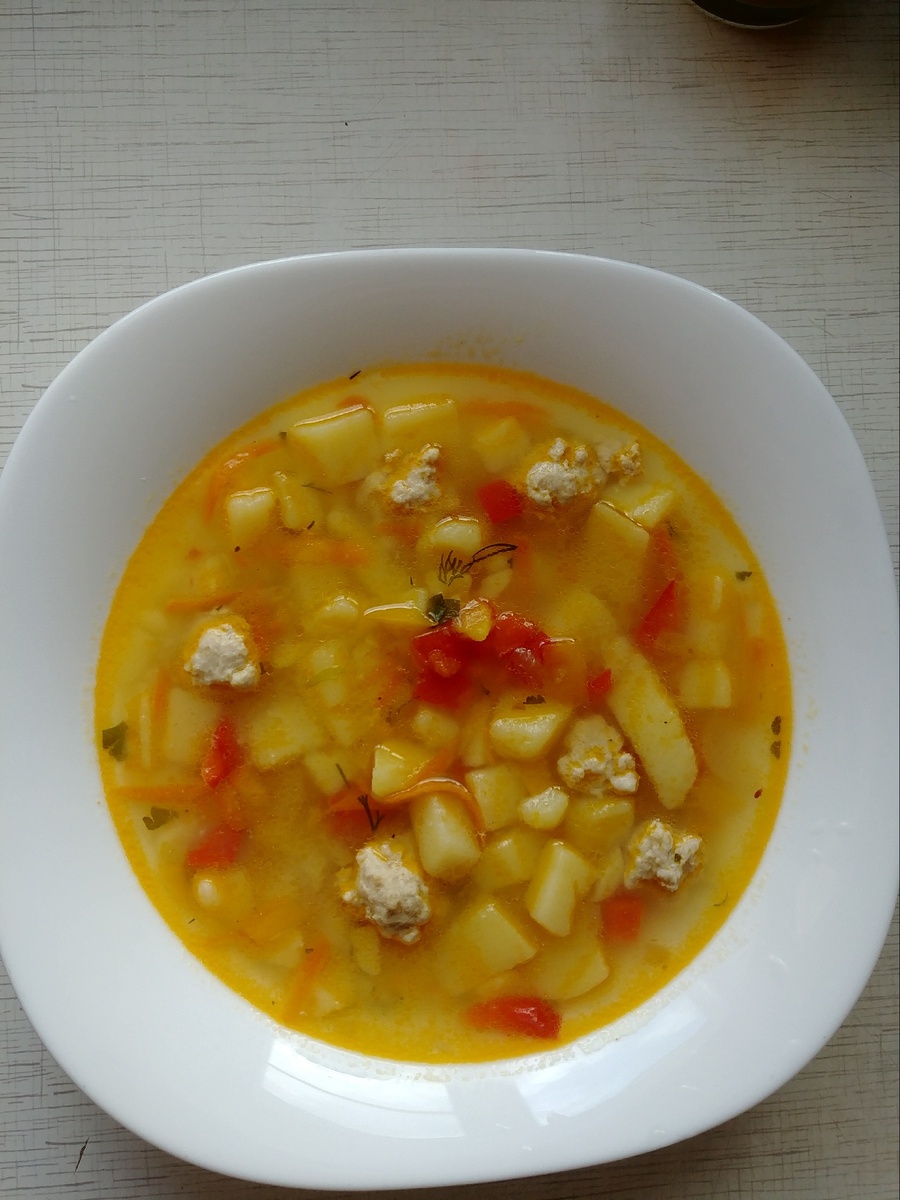 Ингредиенты: Фарш индейки 300 гр Картофель 5 шт Лук 1 головка Морковь 1 шт Яйцо куриное 1 шт Перец болгарский 2 шт (красный и желтый) Вода 4 литра Зелень, соль, приправы по вкусу Приготовление: В фарш добавляем яйцо, соль и хорошо перемешиваем. В кипящую воду закидываем фрикадельки (для их формирования можно использовать две чайные ложки). После закидываем за ранее почищенный и нарезанный картофель, пока картофель и фрикадельки варятся обжариваем мелко нарезанные овощи (лук морковь перец болгарский) до легкой золотистости. Как фрикадельки с картофелем сварятся добавляем обжаренные овощи , кипятим 5 минут. Соль специи по вкусу.
