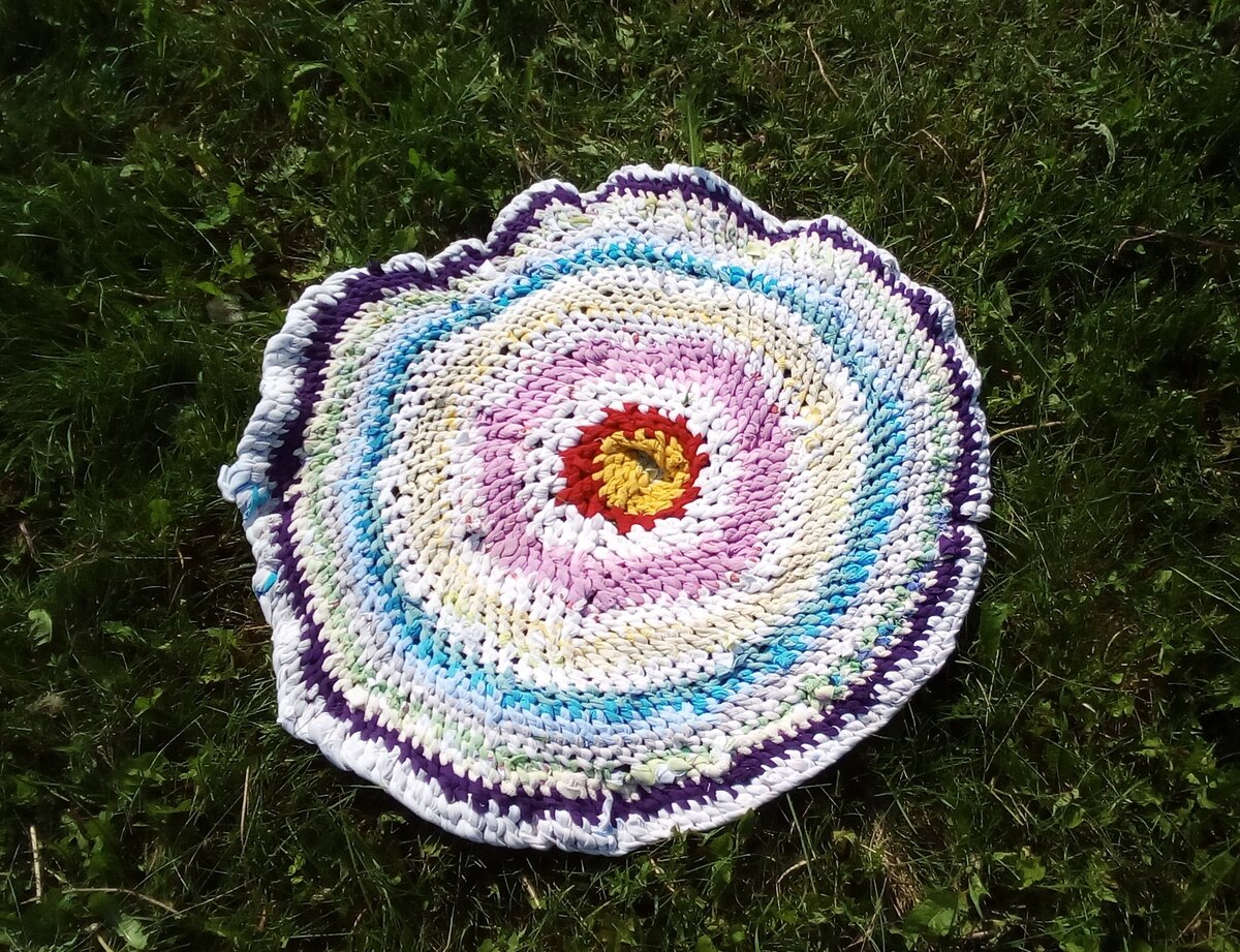 Коврики из трикотажа Если вы живете по принципу Zero Waste (ноль отходов), то знаете, что каждой вещи можно придумать вторую, и даже третью жизнь. Но если вы и не слышали про это направление, то все равно не спешите выбрасывать старые трикотажные вещи. Из них можно сделать отличный коврик. Для начала нужно подготовить одежду: выстирать и разрезать на полоски. Если полоски делать около 0,5-1 см в ширину, то коврик получится тонкий, петли будут небольшие. Он отлично ляжет на полу, и вы не запнетесь об него. Правда, плести его придется дольше. Если полосочки очень тонкие, то удобнее вязать толстыми спицами или крючком. Если трикотажные ленты делать шириной 2-4см, то вы сможете сплести его всего за пару вечеров. Коврик получится пушистый, мягкий и объемный. Но на входе его лучше не класть. Кстати, этот коврик можно связать прямо руками! Разрезанные полоски трикотажной пряжи удобно смотать в клубки, идеально – разобрать по цветам. Теперь сам процесс. 1. Для начала возьмем 2 ленты – одну