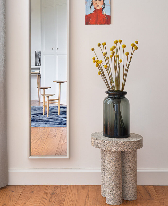 Интерьер квартиры-студии площадью 40 кв. метров в Москве — проект Анастасии Ореховой. При небольших метрах и бюджете в 1,5 млн рублей дизайнер смогла создать комфортный, приятный во всех отношениях интерьер. Как это удалось — рассказывает автор. Квартира находится в сталинском доме. Единственный нюанс — отсутствие окна в одной из зон. Мы решили сделать там спальню. Так вместо предполагаемой однокомнатной квартиры у нас получилась студия. Хозяева квартиры — молодая пара, любят путешествовать. На момент покупки в квартире не было стен за исключением тех, что отделяли санузел. Единственным нашим вмешательством стало возведение стены слева от входной двери — она была нужна, чтобы выделить прихожую. В итоге на 40 кв. метрах получилось сформировать прихожую, зону кухни, обеденную зону, гостиную, полноценную рабочую зону, спальню и санузел. Несмотря на ограниченный бюджет и пожелание заказчиков покрасить все стены белым, мне хотелось создать для них индивидуальный, штучный интерьер. В стеллаж