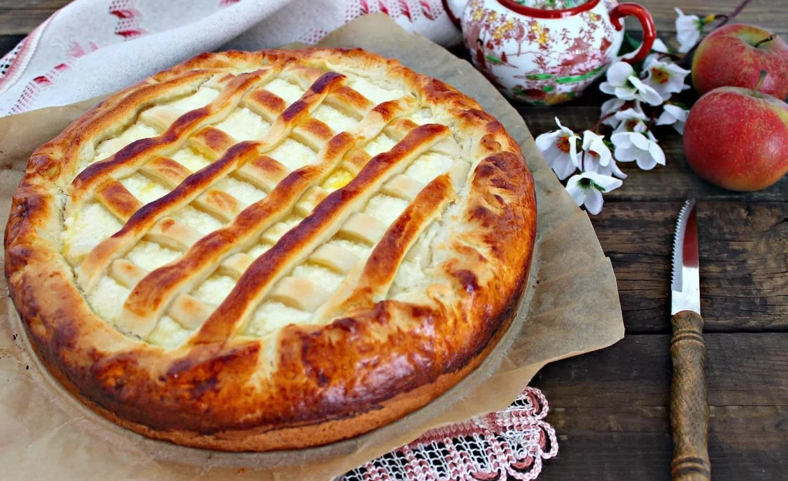 Ингредиенты: Приготовление: Молоко немного подогреть, снять с огня. Всыпать в молоко дрожжи и 1 столовую ложку сахара. Перемешать и дать постоять в тепле 15 минут. Затем просеять горкой половины муки и влить в нее дрожжевую смесь, растительное масло, 80 грамм сахара и 2 яйца. На водяной бане растопить сливочное масло и добавить его в муку. Замесить однородное эластичное тесто, порциями добавляя остальную муку. Готовое тесто должно легко отставать от рук. Накрыть тесто влажным полотенцем и оставить в тепле на 1,5 часа. Для начинки смешать оставшееся 1 яйцо, творог, сметану, остатки сахара, и ванильный сахар. Для более нежной текстуры можно взбить хорошенько миксером или блендером. Тесто раскатать и выложить в смазанный маслом противень, сформировать бортики будущего пирога. Немного теста оставить для украшения. Выложить на тесто творожную начинку. Из оставшегося теста раскатать тонкие жгутики и выложить на творог крест-накрест ( по желанию). Смазать пирог взбитым яичным желтк