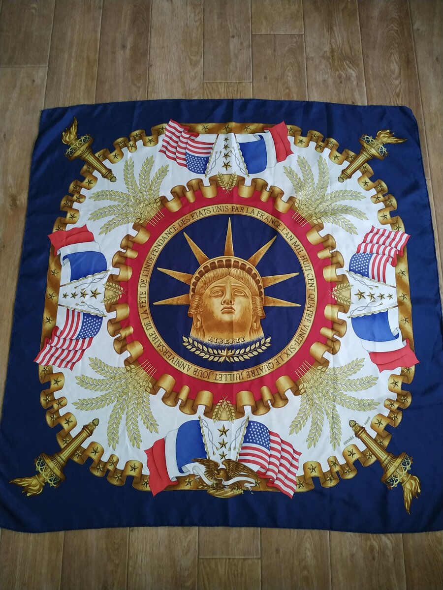Всем здравствуйте! Сегодня я вам покажу свой платочек, который я нашла в Секенд хенде. Честно скажу, когда его увидела у меня закружилась голова - за полную стоимость всего за 250 рублей продавался платок Hermes!!! Шелк, ручная подгибка!!!! А рядом с ним висели платки из полиэстера за большую стоимость!!! Вот как продавцы оценку товара там устраивают? По весу, а не матерьялу? Конечно же я его схватила и быстрее- быстрее на кассу))) А уже дома, рассмотрев его получше полезла в интернет искать информацию о этом платке, но к сожалению не нашла, но опять нашла на Ebey такой же платок. Вот такая вот удачная находка! Понравился платок? Да? Нет?