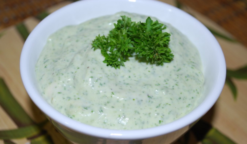 Ингредиенты 100-110 г адыгейского сыра 2 ст.л. белого винного уксуса 3-5 веточки зелени (укроп, петрушка, эстрагон, зеленый лук, базилик) 2 ст.л. оливкового масла 2 зубчика чеснока (по желанию) 5 ст.л. бутилированной воды соль черный перец свежего помола Пошаговый рецепт Шаг 1 Зелень (только листья) и чеснок (если используете) мелко нарежьте. Шаг 2 Адыгейский сыр раскрошите и разомните вилкой с уксусом до гладкости. Вмешайте зелень, оливковое масло, понемногу добавьте воду, пока не получите соус нужной консистенции. Приправьте солью и перцем по вкусу. Шаг 3 Переложите готовый соус в чистую емкость и поставьте в холодильник, где он может храниться до 4-х дней.