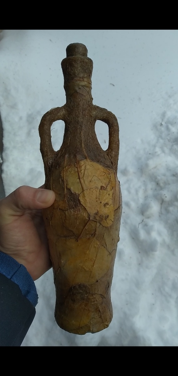 Для изготовления данной бутылки мне понадобилось: 1) бутыль 2) клей 3) жидкое стекло 4) пакля 5) листья тополя 6) лак по дереву Данной бутылкой можно пользоваться в быту, хранить пищевую продукцию, воду, алкоголь, масло и т. д. Благодаря твёрдому покрытию можно мыть с наружи. Данная бутылка сделана от нечего делать, с целью чтобы забыться. Идея родилась в процессе, взяв в руки клей и не обычную бутылку.