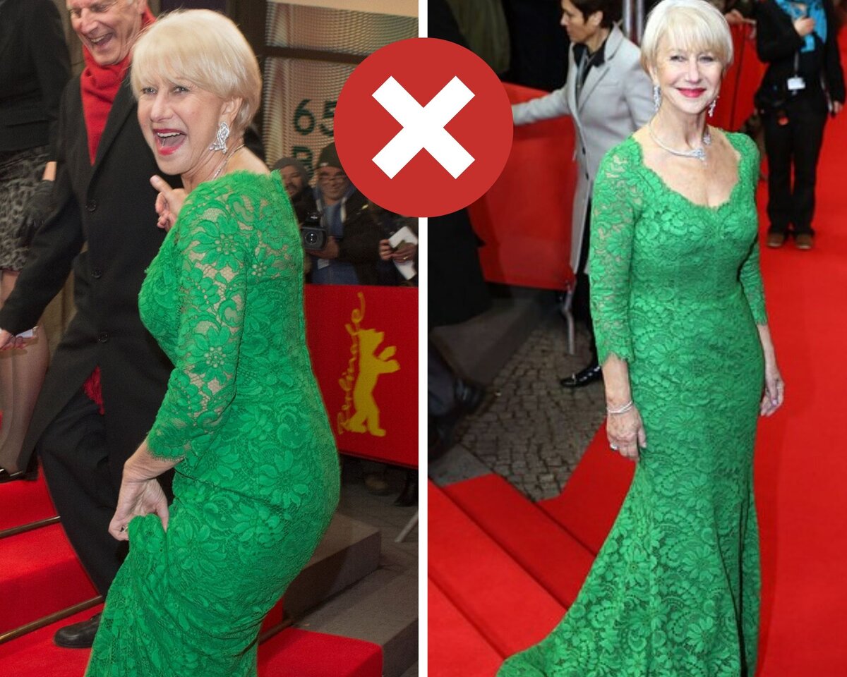 Хилен Мирен не угадала с цветом. Травяной оттенок зелёного не идёт почти никому (за исключением разве что юных моделей, наделённых яркой внешностью). Увы, образ получился провальным. Не спасло его ни дорогое кружево, ни именитый бренд Dolce & Gabbana.