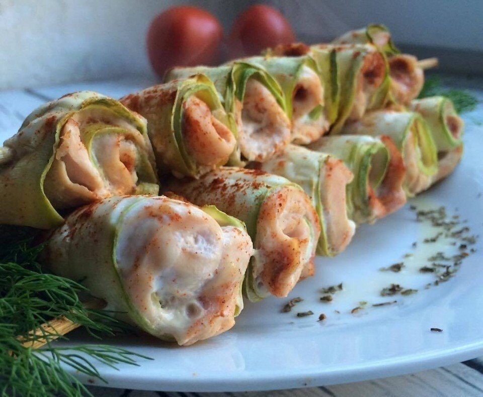 Ингредиенты: 🥰Куриное филе 400г 🥰200 г кабачка 🥰Йогурт 30г 🥰Паприка 🥰Соль,перец ‼️Приготовление: ‼️ 1)Куриное филе нарезать на тонкие полоски, посолить , поперчить 2)Кабачок нарезать овощечисткой на тонкие слайсы 3)Берем слайс кабачка полоску филе, крутим рулет и накалываем на шпажку 4)Выкладываем шпажки на противень смазываем йогуртом и посыпаем паприкой 5)Запекаем 20-25 минут при 200°