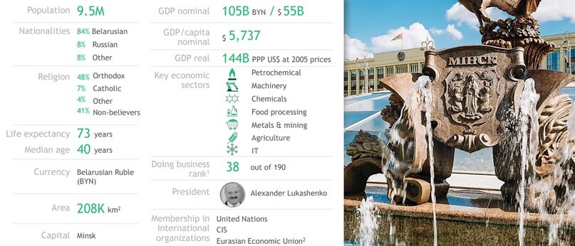 Беларусь является развивающейся страной среднего размера в Восточной Европе. Динамика ВВП зависит от обменного курса и колебания цен на сырьевые товары. Беларусь состоит из 7 административных единиц - города Минска и 6 областей: Минской, Гродненской, Гомельской, Витебской, Могилевской и Брестской. В регионах разные промышленные специализации, чаще всего машиностроение, пищевая и нефтехимические отрасли. Минск и Минская область обеспечивает ~ 50% ВВП Беларуси. До 2016 года экономика прошла через ряд кризисов: 2009 год: системные проблемы в мировой экономике. 2011: валютный кризис в Беларуси - девальвация. 2015-2016: падение цен на нефть, кризис ведет к девальвации национальной валюты и процессу деноминации рубля. 2016-2017 годы: Экономика восстанавливается за счет уменьшения инфляции, снижения ставки рефинансирования с 24% до 11% в течение 2 лет, увеличения количества инвестиций и восстановительного роста ВВП. 2018-2022: Экономические прогнозы таковы, осторожный оптимизм, рост реаль