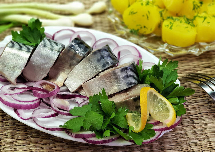 Скумбрия соленая по этому рецепту готова к употреблению уже на следующий день, а все ингредиенты у каждой хозяйки всегда в наличии.