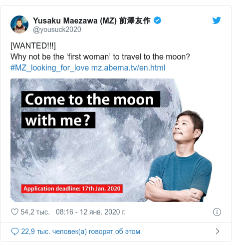 Известный миллиардер Юсаку Маэдзава официально стал первым пассажиром частного рейса космического корабля space x который планирует полет на луну. Теперь же 44-летний японец в twitter заявил о том что хочет отправиться в такое путешествие ни один и приступил к активному поиску спутницы Маэдзава отметил что хотел бы найти спутницу которая готова к столь увлекательному приключению. Почему бы не стать первой женщиной отправившийся на луну я хотел бы видеть девушку старше 20 лет с яркой индивидуальностью и заинтересованную в полетах в космос. Написал миллиардер в своем twitter блоги результаты такого кастинга он пообещал огласить 17 января. Именно в этот день станет известно кто станет первой девушкой которая отправится в лунное путешествие на пассажирском космическом корабле старт первого туристического полёта на луну организованного илоном маском и его компанией space x запланирован на 23 год дорогие девушки дерзай запланирован на 23 год дорогие девушки дерзайте ведь сейчас прототипы