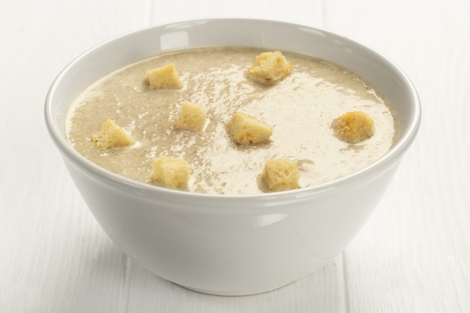 Ингредиенты: Шампиньоны 250 гр Картофель 500 гр Лук репчатый 1 головка Сливки 33% 200 гр Соль по вкусу Приготовление: Мелко нарезанный лук обжариваем до золотистого состояния . Картофель предварительно почищенный и нарезанный отвариваем до полу готовности, добавляем нарезанные грибы варим до полной готовности ,после добавляем обжаренный лук и сливки , после закипания взбиваем погружным блендором до однородной массы солим по вкусу доводим до кипения . Подавать с белыми сухариками .