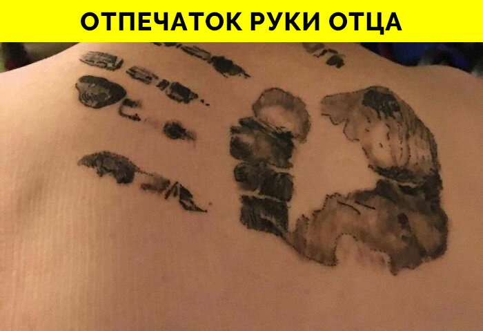 Некоторые люди думают, что татуировка - это бессмысленная и бесполезная вещь, но не все согласны с этой точкой зрения. Многие люди набивают себе татуировки по различным причинам: для красоты, скрыть свои шрамы, но есть такие, которые были сделаны по особым личным причинам. Поэтому какими бы они не были, в них всегда будет больше смысла, чем во многих красивых тату. Отпечаток руки Перед уходом отец этого парня похлопал его по спине и сказал "Что бы ни случилось, помни, я всегда рядом". 761099 Эти цифры - порядковый номер, который носил дедушка этого парня, когда попал в концлагерь во время второй мировой войны. Несмотря на все трудности мужчина смог воспрянуть духом и счастливо дожить до 96 лет, став примером для подражания для своего горячо любимого внука. После похорон парень сразу же отправился в тату-салон, чтобы увековечить память о человеке, которого он безгранично уважал. Весь процесс занял не больше 5 минут. Когда работа была закончена, мастер поинтересовался о смысле этих ци