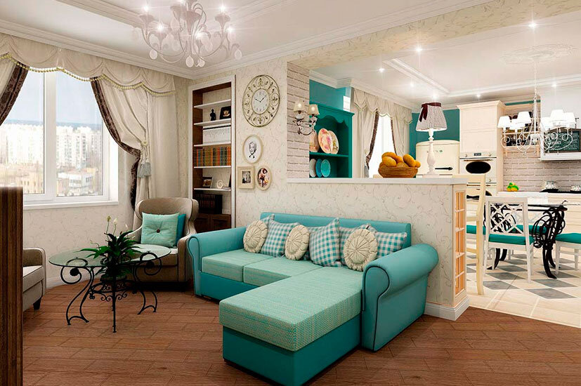 - Прованс. Стиль, близкий к классике, но лишенный ее вычурности. Пришел к нам с лавандовых полей Франции. Отличается обилием света, цвета. В декоре применяется мелкий цветочек, натуральные ткани, шкафчик с посудой за стеклом, коврики-дорожки.