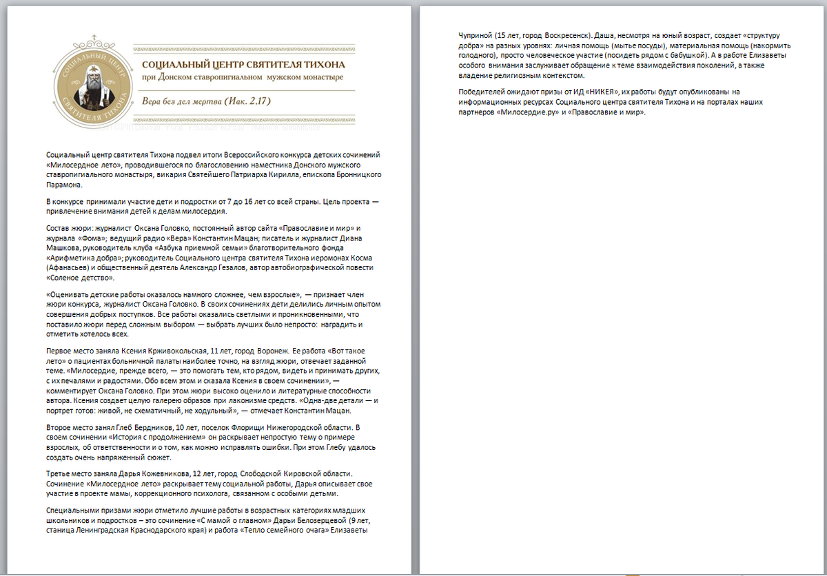 Социальный центр святителя Тихона осенью 2017г организовывал Всероссийский конкурс детских сочинений «Моё милосердное лето». Моя дочь приняла участие в этом конкурсе. Приведу сочинение, сохраняя стилистику автора: