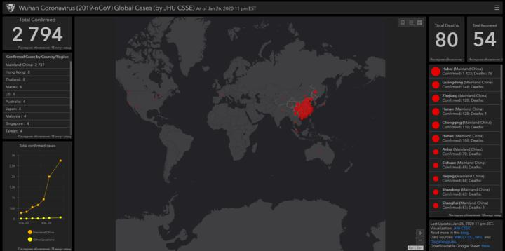 Специалисты Исследовательского центра системных наук и инженерии (CSSE) университета Джонса Хопкинса (США) создали онлайн-сервис, с помощью которого можно отслеживать распространение китайского коронавируса по всей планете. Сервис обновляется в режиме реального времени и отображает актуальные данные, собранные Всемирной организацией здравоохранения. На карте красными точками отображаются очаги распространения коронавируса, также есть информация о количестве подтвержденных случаев заболевания, а также количестве смертей и выздоровлений. Напомним: случаи заболевания были зарегистрированы по всему Китаю, за исключением Тибетского автономного района. Больше всего заразившихся в провинции Хубэй, где впервые была зарегистрирована вспышка коронавируса. Коронавирус также выявлен в Таиланде, Японии, Южной Корее, США, Вьетнаме, Сингапуре, Малайзии, Непале, Франции, Австралии. Вирус проявляет себя так же, как и обычная ОРВИ: появляется насморк, кашель, конъюнктивит. Температура может повышатьс