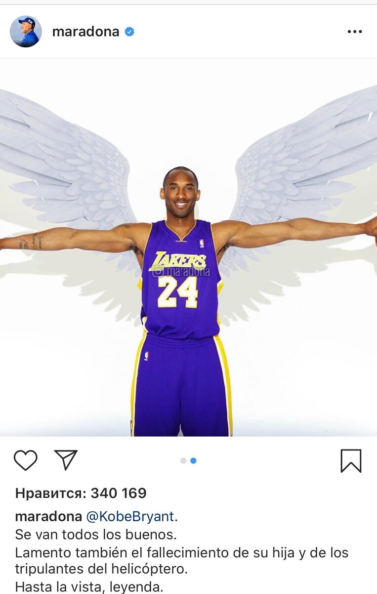 К сожалению, жизнь не вечна. Каждый день в мире уходят великие люди. Коби Брайант - американский баскетболист, выступавший 20 сезонов за "ЛА Лейкерс" в НБА. 26 января 2020 года, вертолет, в котором находился Коби и его 13-летняя дочь, а также еще 7 человек, потерпел крушение в холмах близ города Калабасас. Весь мир скорбит о данном игроке, бывшие и нынешние футболисты не стали исключением и высказались по этому поводу. Марадона «Уходят все лучшие. Я также выражаю сожаления в связи с гибелью его дочери и экипажа вертолёта. До встречи, легенда», — написал аргентинец в Инстаграм. Неймар О голе, который он посвятил Коби «Потеря Коби Брайанта очень печальна для всех, кто связан со спортом, а не только для фанатов баскетбола. Я увидел сообщения об этом в перерыве матча и посвятил ему свой гол во втором тайме, надеюсь, он покоится с миром»,- сказал бразилец. Криштиану Роналду «Так грустно слышать душераздирающие новости о смерти Кобе и его дочери Джанны. Кобе был настоящей легендой и вдох