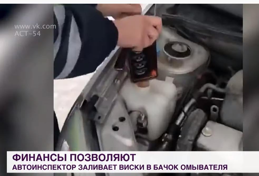В прошлом месяце в интернет попало видео о том, как сотрудник госавтоинспекции, находясь при исполнении и в полной форме, наливает в бачок стеклоомывателя патрульной машины жидкость из бутылки американского виски. Эта не совсем обычная процедура была записана и выложена на сайт соцсети ВКонтакте. В записи присутствовала нецензурная брань и шутки сотрудника полиции на тему того, что работник госавтоинспекции может себе позволить для очистки стекол дорогое виски. Так как в интернете хватает психически неуравновешенных людей, историю придали огласке, после чего она получила большой резонанс. В дальнейшем, по факту опубликованного видео, новосибирским ГУ МВД была инициирована служебная проверка. Благодаря ей, выяснилось, что там фигурирует настоящий сотрудник госавтоинспекции. Им оказался ст. лейтенант полиции Д.Чухрий.