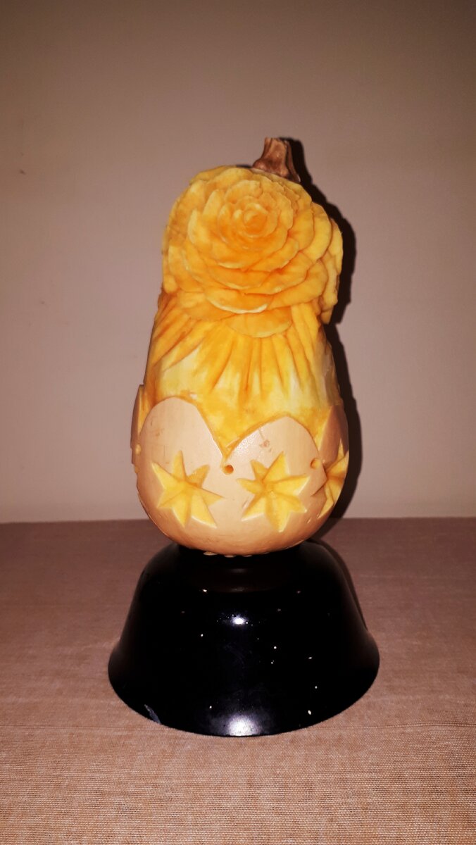 Так как один день тыква стояла в холодильнике, она свежая и красивая, докупила редьку дайкон и вырезала еще цветы. Тыкву разрезала на две части и получилась маленькая ваза.