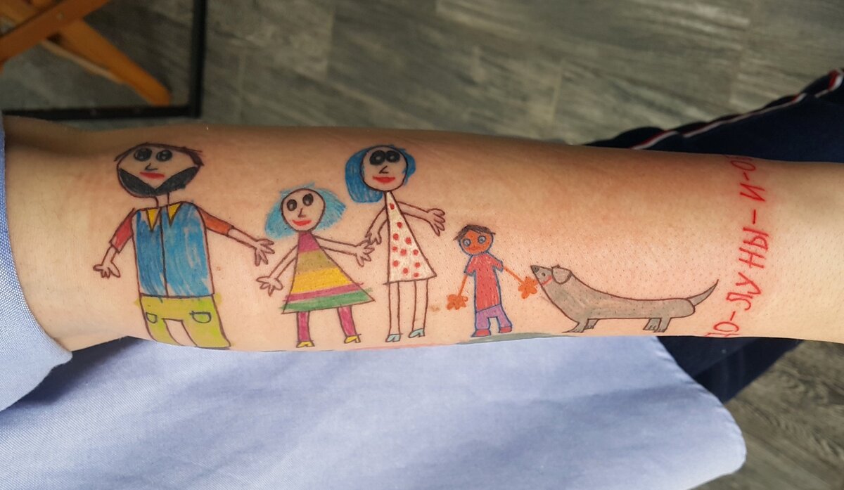 Эту историю узнали от самого тату-мастера Евгении Колодины. Она живет в Златоусте Челябинской области. Эту работу она лично называет «самой хайповой в 2019 году». Клиентка попросил мастера перенести на руку детский рисунок ее дочери. — Писали много, да и сейчас до сих пор спрашивают: «Как она осмелилась?», «Серьезно, это тату? И это не смыть!», — рассказывает Евгения. История татуировки оказалась весьма трогательной: — Пятилетняя дочка по просьбе мамы нарисовала этот рисунок и родительница набила себе на руке. Ведь дети вырастут, улетят из родительского дома. А тату останется напоминанием о тех временах, когда дети были маленькими и всегда рядом с родителями, когда небо было чище, солнце ярче и деревья зеленее.И именно такой рисунок будет хранить в себе больше тепла и воспоминаний, ведь все штрихи, линии и цвета мы досконально перенесли с рисунка девочки, — поделилась мастер.