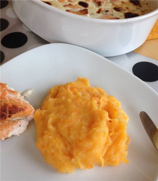 картофель (уже очищенный) 750-800гр морковь (уже очищенная) 370гр. чеснок 5 зубчиков сливочное масло 50гр-80гр соль Это оооочень простой гарнир и моя фирмовая картошка-пюре уже не первый год. Это просто картофельное пюре с морковкой в одном флаконе, но это очень вкусно. Рождение сего блюда произошло когда-то давно, когда я тушила картошку и явно перебухала туда моркови. Однако на выходе получилось великолепно: у картофеля появился легкий сладковатый привкус моркови, и он отлично сочетался. Пришедшие в гости друзья (а для гостей картошка и тушилась) задумчиво сказали - "Такой вкусный гарнир. Как ты делала?" "Нечаянно переборщила с морковкой!" "И все?!)))". Ну да... и все...)) Чуча вечно удачно что-нибудь во что-нибудь уронит, пристроит остатки или забудет положить. Иногда из этого выходят прямо-таки шЫдевры.)) 1. Очистите картошку, особо крупную можно разрезать на пару-тройку запчастей и складываете в кастрюлю. 2. Чистите морковку, режете шайбочками примерно по 1- 1,5 см толщиной и тож