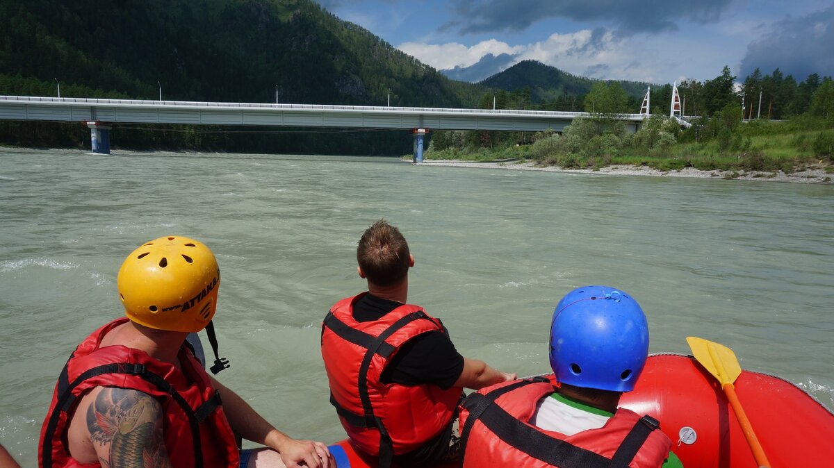 Любопытно было наблюдать как люди резко менялись от начала поездки и до момента старта. В начале все были расслабленные, кое-кто был сонным, после вчерашней, проигранной, битвы с Зеленым Змием, а кто-то просто болтал мало понимая куда они едут, но насколько все изменились в туже секунду когда холодная вода Катуни омыла их босые ноги и все заметили насколько быстрое течение. Из окна автобуса, или даже стоя на берегу нет такого ощущения, но в рафте все меняется. Там тебя от бурного течения защищает лишь тонкая резина заполненная воздухом.