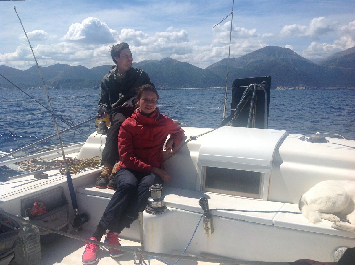На Дукате побудка, девушки сварганили завтрак, парни подготовили яхту к выходу. Старт в 9-00. Из бухты вышли на стакселечке, но буквально через пару миль поворот, вмордутык и волна, пошли на моторе. Завтракали на ходу. Сразу поставили воблер на тунца и прочее.