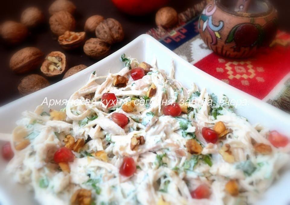 Принцип один: разварить как следует мясо и разобрать его на ниточки. Мясо нужно отварить как следует, чтобы оно буквально таяло. Затем порубить грецкие орехи, нарезать зелень, добавить чеснок, соль, перец, камац(сцеженный) мацун. Размешать. Подавать, украсив зернами граната.