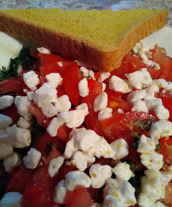 Завтрак из салата с творогом и кусочка хлеба с куркумой
