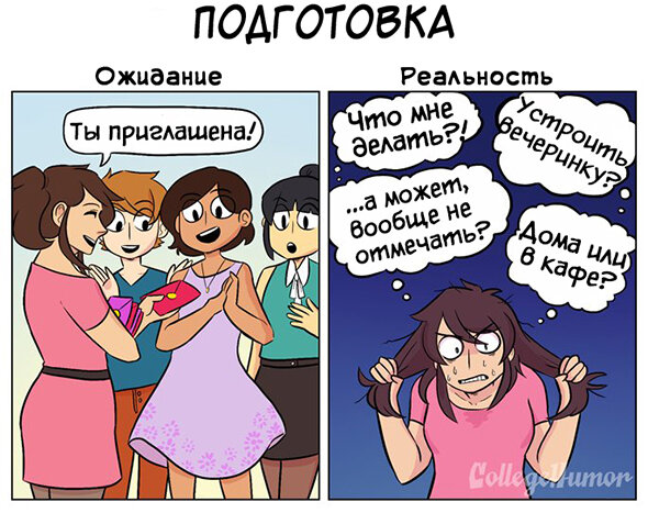 Художники из CollegeHumor - Жасмин Пирс и Карина Фарек - придумали и нарисовали несколько весёлых комиксов в стиле "Ожидание/Реальность", показав, как сильно празднование нашего дня рождения может отличаться от намеченных нами планов!