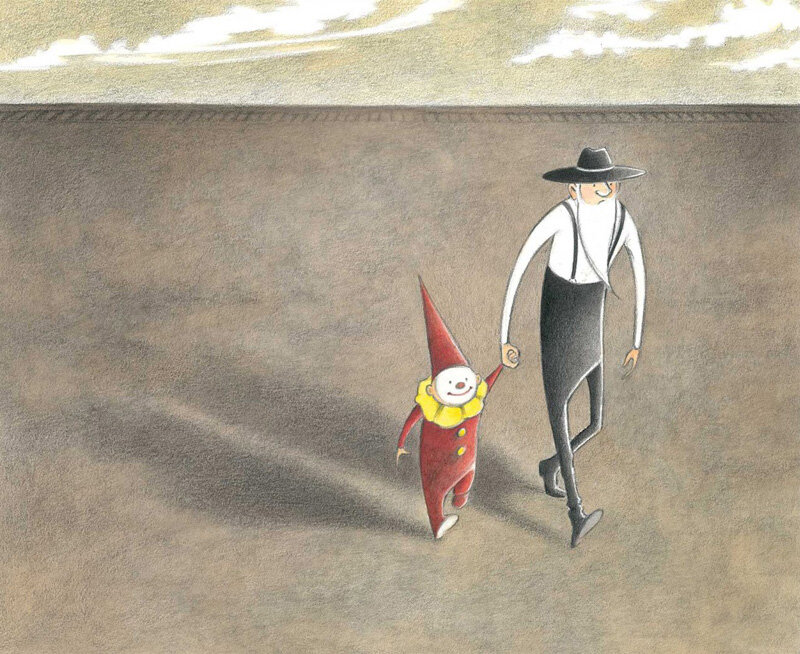 Книжка Марлы Фрейзи "Фермер и Клоун" - отличный пример того, как использовать в повествовании противопоставление и работать на контрасте, сделав простую бесхитростную историю эмоциональной и живой. Хмурый и не слишком приветливый фермер возделывает обширное серое поле, раскинувшееся от края до края, когда обнаруживает в своих владениях маленького ребенка в ярком клоунском костюме. Свалившись с проехавшей цирковой повозки, тот нисколько этим не обеспокоен и лишь широко улыбается при виде огромной несуразной фигуры. Фермер вынужден позаботиться о малыше, что совершенно в его размеренные планы не входит. Но постепенно, в процессе их общения, в течение дня зарождается дружба, благодаря которой эти двое сделают множество неожиданных открытий - как и о друг друге, так и о себе самих. Марла Фрейзи, двукратно удостоенная Премии Калдекотта, использует в своих рисунках почти монохромную золотисто-песочную палитру, рисуя безжизненный пустынный пейзаж. В это безрадостное пространство, залитое ра