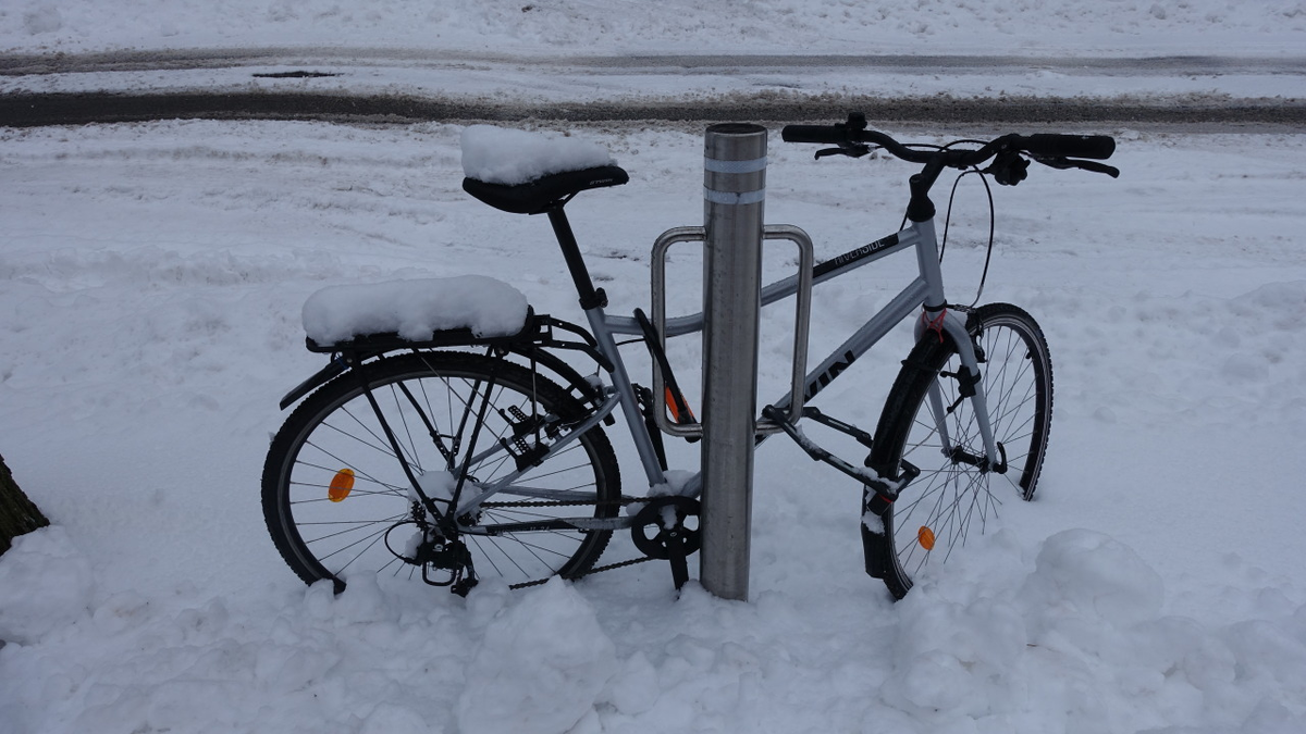 Поэтому пока человек находится на работе, велосипед легко может занести снегом.