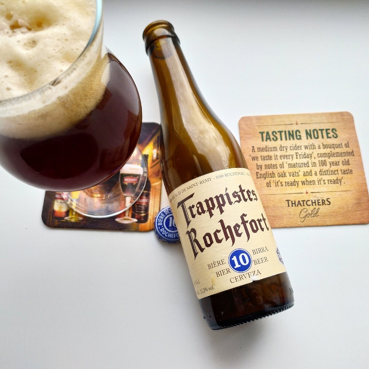 Продолжая тему Бельгийского пивоварения и в частности траппистов,сегодня у нас Trappistes Rochefort 10 - квадрюпель с дображиванием в бутылке из Бельгийского аббатства Notre-Dame de Saint-Remy. ABV (Алк.): 11,3 % OG (Пл.): 21,8 % IBU (Горечь): 27 ---------------------------- Цвет: Темно-медный.Большая и устойчивая бежевая шапка. ---------------------------- Аромат: Темные фрукты и сухофрукты, яблочные и винные ноты,карамель. --------------------------- Вкус: Фрукты,яблоко,груша,сухофрукты,немного карамели и специи и пряности,легкая горчинка.Послевкусие продолжительное,пряное. -------------------------- Итог: Что тут скажешь,мировой уровень,по крайней мере для меня. Приятная и сложная вкусо-ароматика,алкоголь лишь немного ощутим и карбонизация выше средней. Здесь нет перебора с горечью,сладостью или алкоголем,отличный баланс. Дикого восторга нет, но от такого пива,действительно,получаешь удовольствие. ------------------------- Оценка: 10 из 10.