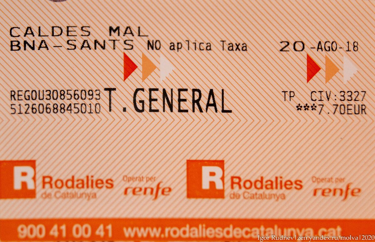 По этому билету я ехал из небольшого города Калдес-де-Малавелья в Барселону, расстояние между которыми примерно сто километров. Цена проезда 7,70 евро, то есть около 550 рублей. Дорого ли это? Как по мне, это дорого, учитывая, что поезд совершенно не скоростной, а самый что ни на есть обычный.