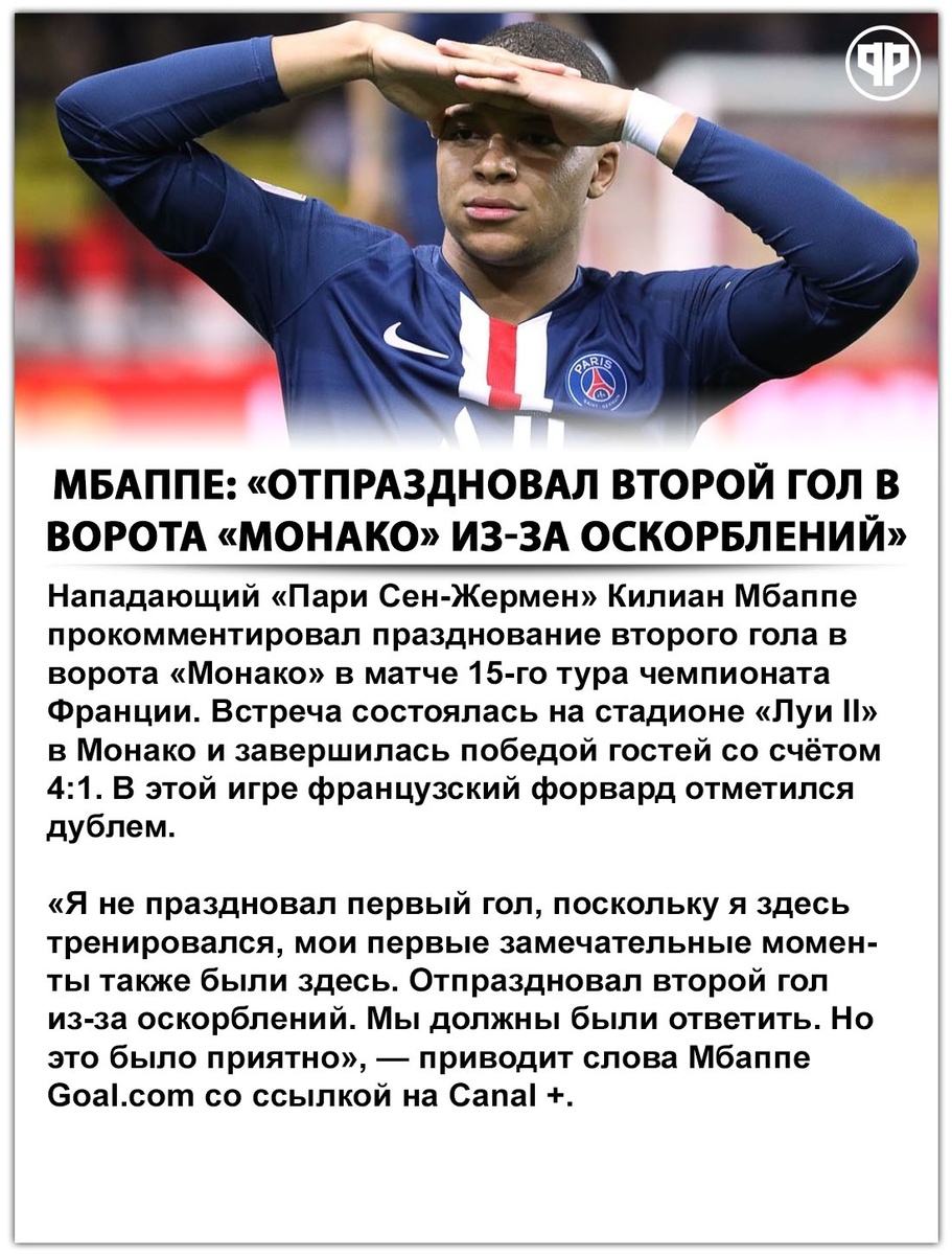 Мбаппе рассказал почему отпраздновал второй гол в ворота "Монако"