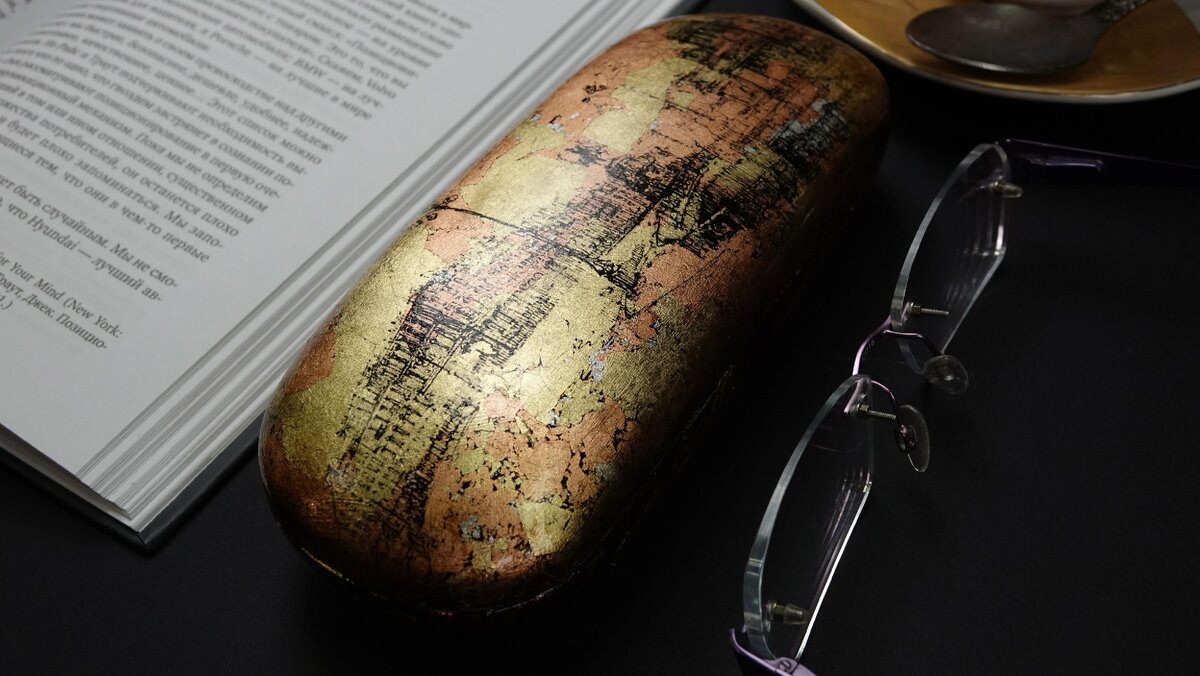 Декор футляра для очков. Золочение классической поталью и вживление изображения.