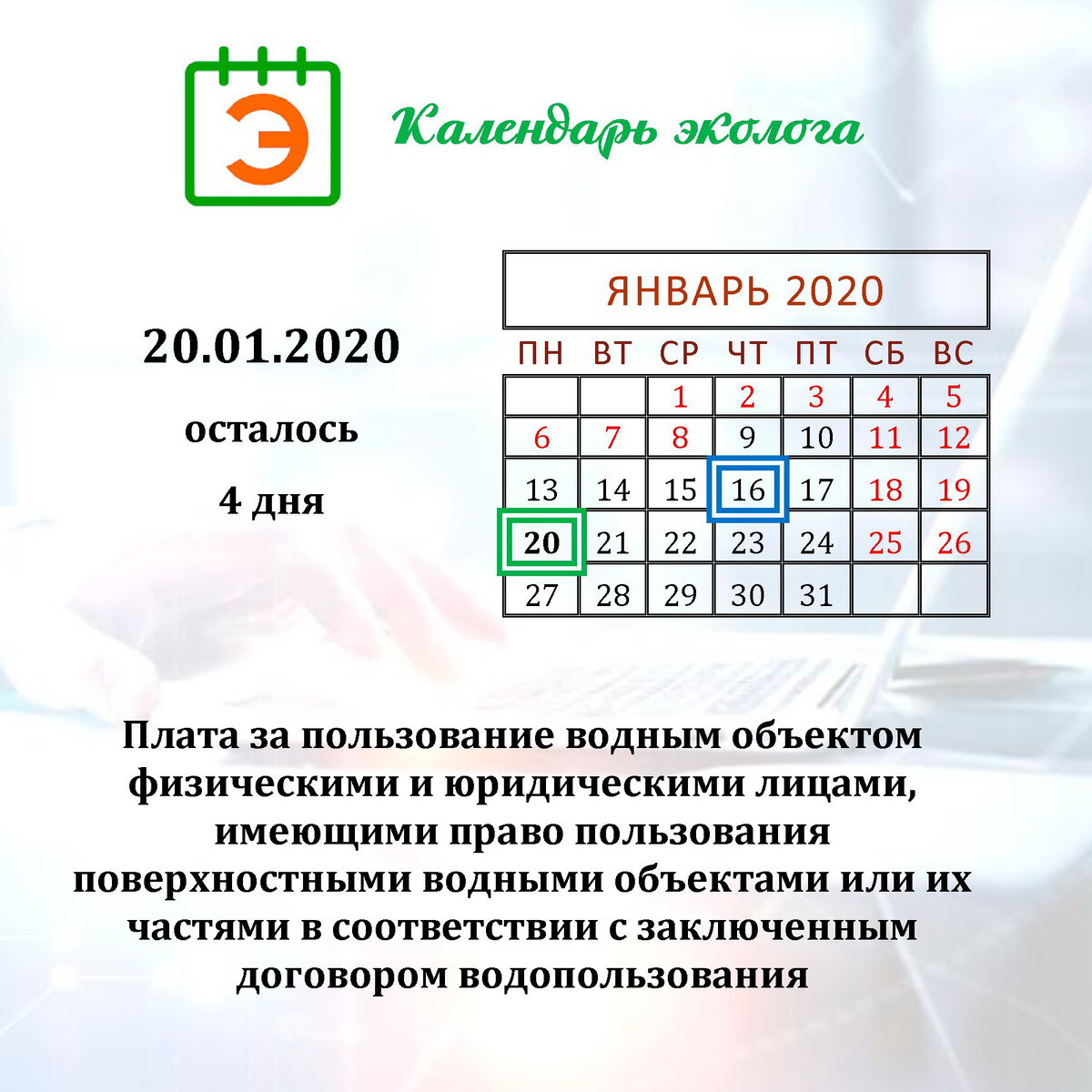 20.01.2020 (Осталось 4 дня) Плата за пользование водным объектом физическими и юридическими лицами, имеющими право пользования поверхностными водными объектами или их частями в соответствии с заключенным договором водопользования #ecocalendar Скачай на Google Play бесплатное мобильное приложение КАЛЕНДАРЬ ЭКОЛОГА и будь в курсе. https://play.google.com/store/apps/details?id=calendar.ecours.xinvestoriginal.ecocalendar