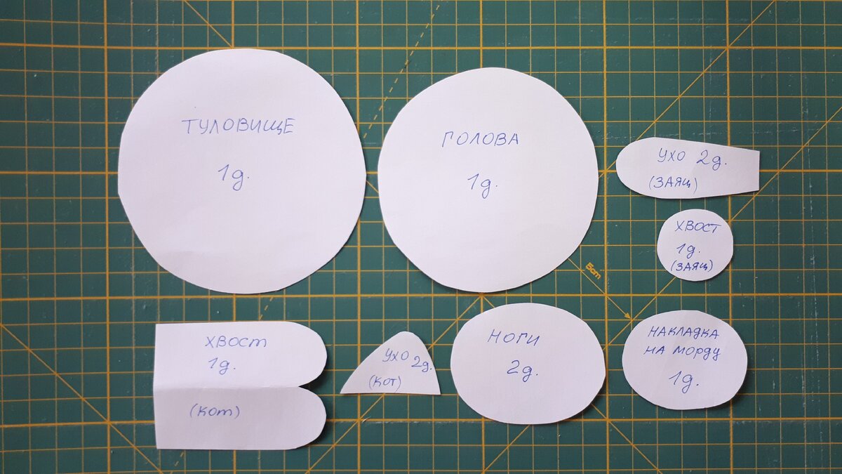 Выкройка рисуется очень просто - два круга, один из них немного меньше другого, овалы для мордочки и для лапок. А вот хвосты и ушки у зайца и кота разные, на фото выкроек вроде все понятно.