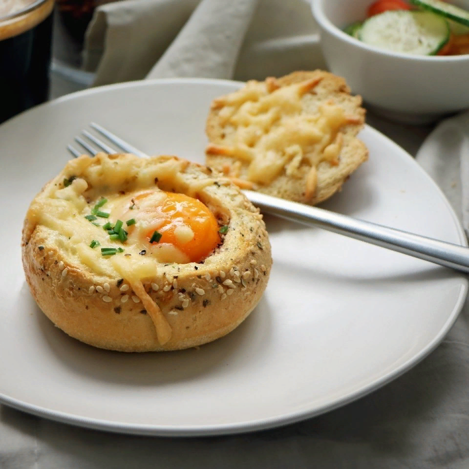 5. Разбить в каждую булочку по яйцу. Посыпать сыром.