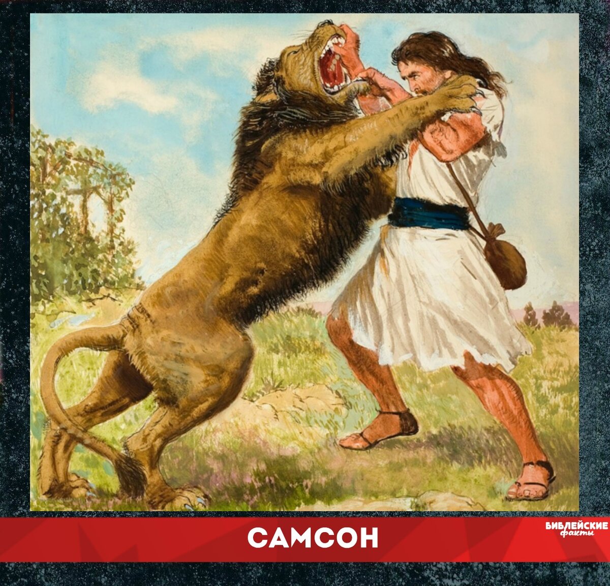 Самсо́н (ивр. שִׁמְשׁוֹן, Шимшо́н). В переводе с еврейского имя Самсон предположительно означает «служитель» или «солнечный». В современном Израиле имя Шимшон — редкость. В библейском тексте указание на то, что Самсон раздирает пасть льву, отсутствует. В Книге Судей говорится следующее: "И сошёл на него Дух Господень, и он растерзал [льва] как козлёнка; а в руке у него ничего не было". Несколько лет назад археологи нашли в Израиле печать Самсона — библейского героя. Согласно Библии Самсон был похоронен в семейной усыпальнице между Цорой и Эштаолом.