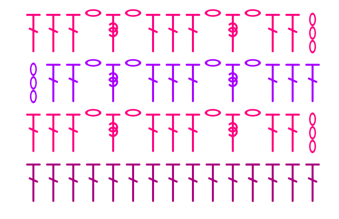 Если Вам нужно обвязать плед или другое плотное вязаное изделие, то Вам вполне подойдут "пышные столбики с боковым смещением на воздушной петле" связанные крючком. А теперь давайте разберем оригинальный узор (Схема 1) на основе пышных столбиков с боковым смещением на воздушной петле и посмотрим, что у нас получится. Сначала я сделала узор в шахматном порядке, но что-то мне не понравилось. Хотя можете попробовать сами и у вас получится красивее! Схема 1 Как мы видим по Схеме 1 узор этот очень простой и с ним справится даже только-только начинающая рукодельница. Сейчас мы свяжем образец и убедимся в этом сами. берем мягкую пряжу (я же вязала такую, чтобы была хорошо видна текстура узора). Набираем 21 воздушную петлю (узор кратен трем) + 3 в.п. подъема и вяжем ССН на всю длину цепочки - 1 ряд. Ряд заканчиваем 3 в.п. подъема и поворачиваем вязание. переходим к вязанию самого узора: 2 ряд: А вот так выглядит этот узор (Рис. 1)