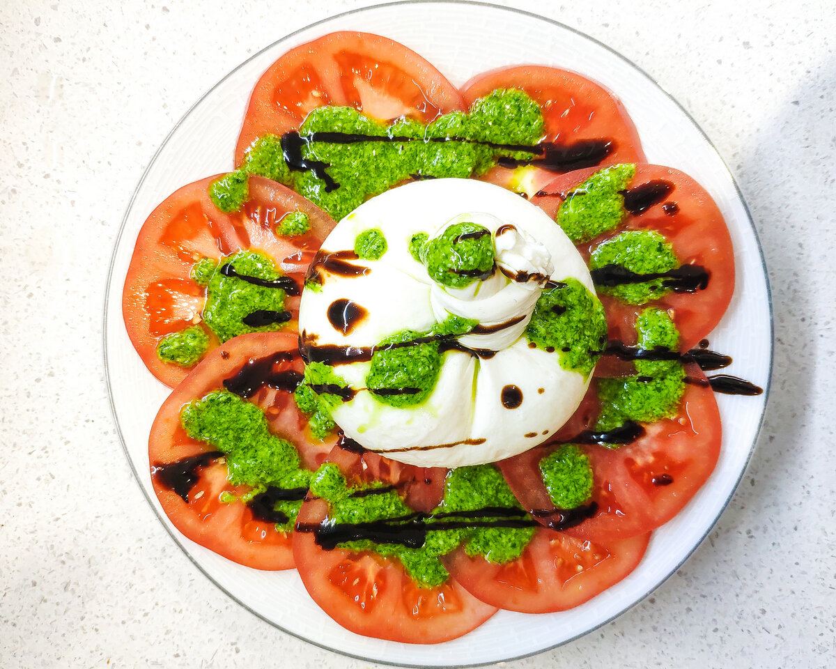 Нарезаем томаты, как-то их выкладываем на тарелку, сверху сыр буррата, песто и украшаем все бальзамическим кремом. Можно для полноты картины добавить в микс еще и какие-нибудь салатные листья, но мы решили, что и так хорошо! Видео-рецепт