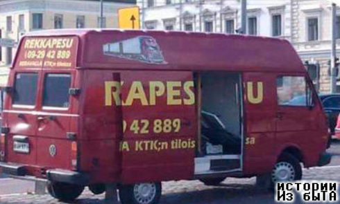 Вопреки распространенному мнению, хорошим дизайнером быть не так уж и просто, потому что необходимо не только строго и в срок выполнять требования заказчиков, но и предусматривать разные варианты использования подготавливаемого продукта, а также вдумываться в мельчайшие детали проекта. Ниже я покажу вам примеры случаев, когда дизайнеры при нанесении логотипов компаний-клиентов не задумались о том, что у машин есть двери, в связи с чем создали ситуации, которые хоть и являются комичными, но явно н понравятся заказчикам. Исключение может быть только в случае, если у этих самых заказчиков есть чувство юмора. Приступим. «Rekkapesu» переводится с финского языка, как «мойка грузовиков». Данная надпись с открытой дверью превратилась в «Rapes u», что можно перевести как «Изнасилуем тебя». Страшновато =) То, что получилось из названия «Парковочной службы в Джерси-сити» можно перевести, как «Управление по вопросам рукоблудия». Вряд ли американским муниципальным служащим нравится подобное определ
