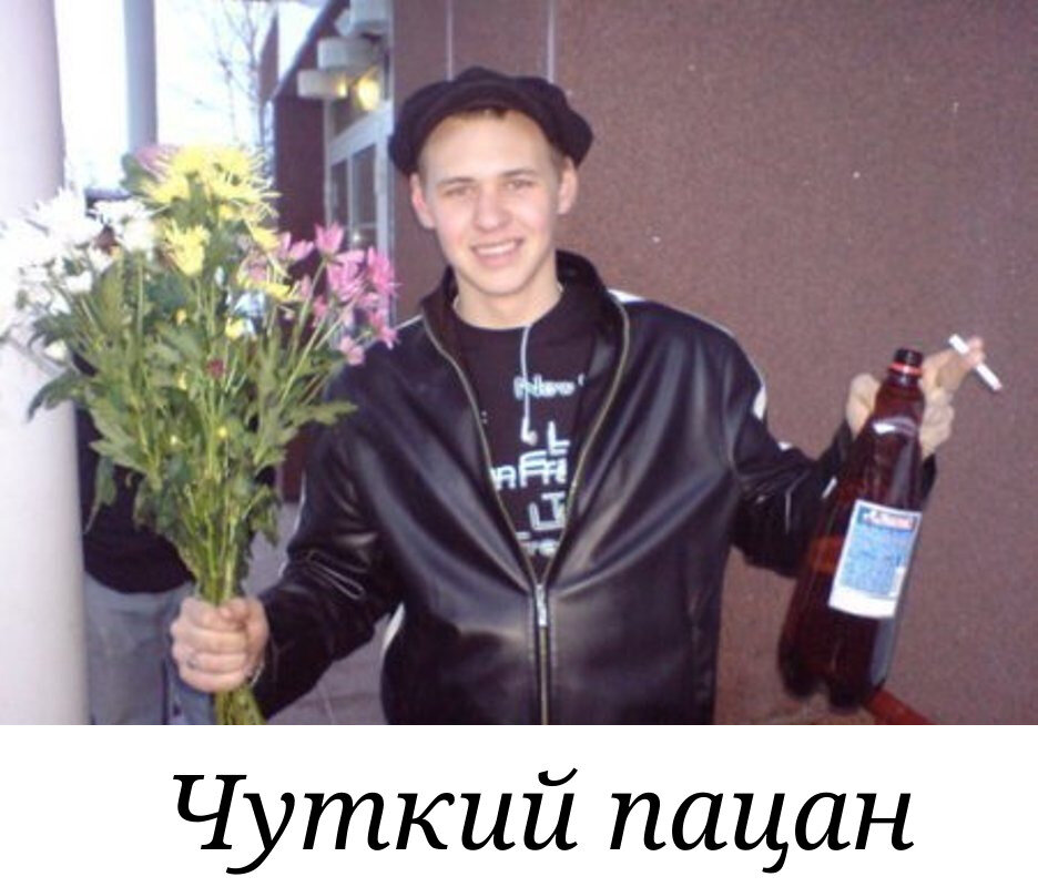 Стоял я возле клуба, выходит парочка. Он - жлобина метра под два, весь в золоте, на понтах, в солнцезащитных очках (это в 2 часа ночи). Она - фифа в стразах и с губами на пол-лица. Жлоб подходит к клумбе, начинает дёргать цветы. Куривший рядом пацанчик обращается к нему: