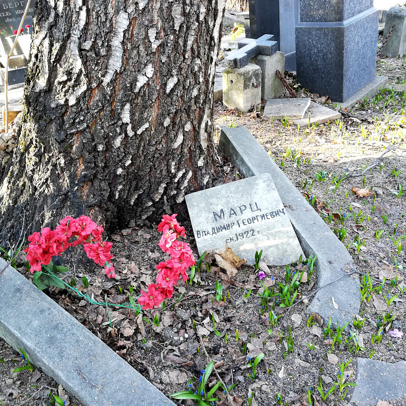 Новодевичье кладбище больше напоминает музей, чем тихий последний приют, экскурсии здесь дело привычное, а похоронные процессии встречаются всё реже. Но если прийти сюда в будний день утром, к открытию, можно успеть побродить среди могил, не натыкаясь на экскурсантов у каждого именитого надгробия. Однажды весной, по пути от Чехова к Маяковскому, я наткнулась на странный памятник — небольшой серый камень лежит у подножия старой березы, на нем только имя и дата — Марц Владимир Георгиевич, ск. 1922. Вокруг камня что--то вроде бетонного бордюра — разбитый, разомкнутый круг.