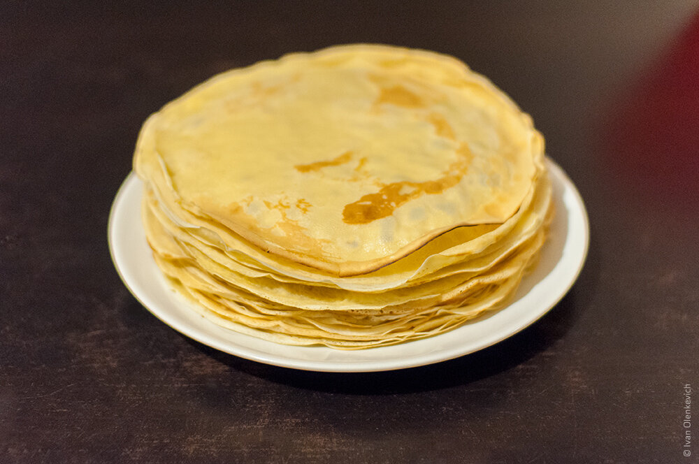 Чтобы сделать двадцать блинов, нам понадобится: — 4 яйца; — 400 граммов муки; — 400 мл воды; — 400 мл молока; — столовая ложка сахара; — чайная ложка соли; — растительное масло. Взбейте венчиком, а лучше блендером. Дальше налейте 400 мл тёплого молока и снова взбейте. Теперь 400 мл тёплой воды. Всё взбейте, а после порциями всыпайте муку. Лучше взбивайте и одновременно подсыпайте муку. Если будут комочки, не переживайте. Когда всё смешали, добавьте столовую ложку сахара. Если любите очень слыдкие блины, добавьте четыре ложки. И чайную ложку соли. Не забудьте плеснуть растительного масла и снова всё перемешайте. Вам очень пригодятся два инструмента: силиконовая лопаточка и кисточка. Первой очень просто переворачивать блины, а второй смазывать сковородку. Для блинов идеально подходит икеевская сковородка. Не забывайте перед каждым блином её смазывать. Наливаем половник смеси на горячую сковородку и хорошенько раскатываем по всей поверхности круговыми движениями. И ставим на сильный огон