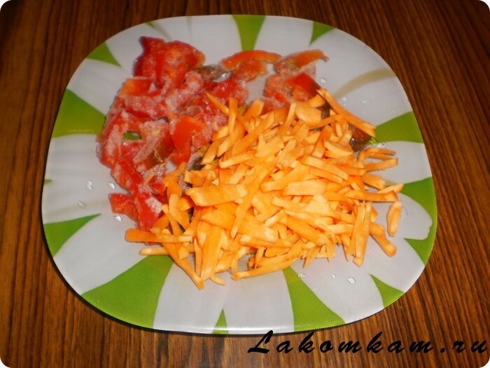 Приготовление куриных крылышек с рисом и овощами в мультиварке. Морковь, болгарский перец и репчатый лук нарезаем соломкой.