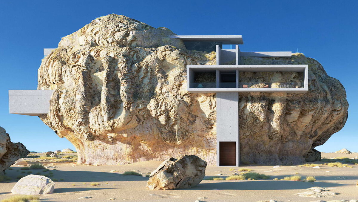 Концепция модернистского бетонного дома, встроенного в гигантскую скалу, возникла как современный взгляд на архитектуру некрополя Мадаин-Салех, объекта всемирного наследия ЮНЕСКО в Саудовской Аравии. «Когда я впервые увидел изображения архитектуры скальных надгробий, я понял, что должен был использовать ее как источник вдохновения в архитектурном проекте», — сказал Кандалгаонкар. — «Существует огромное количество архитектурного наследия, заложенного для нас прошлыми строителями, и я считаю, что они проделали большую работу по интеграции искусственной среды в природные элементы». «Дом внутри скалы» спроектирован так, как будто он вырос из огромного валуна. Монументальная входная шахта первого этажа соединяется с широким прямоугольным жилым пространством, открытым для воздуха по всей внешней стороне. Сырые, открытые бетонные конструкции укладываются вокруг скалистых выступов. Терраса превышает этот объем, приводя наверх к солярию и бассейну, расположенному на вершине обнажения рядом с за